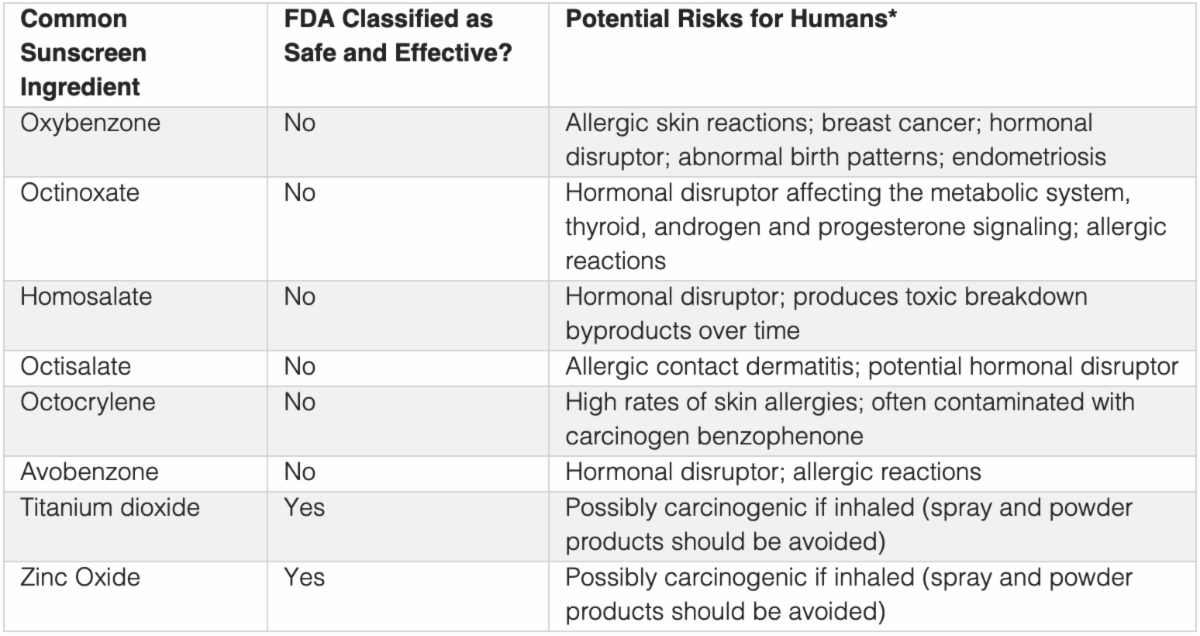 Sunscreen is a double-edged sword. It’s full of ingredients proven to protect our skin from damaging UV rays, but at what cost? The table below outlines some of the human concerns for eight common sunscreen ingredients approved by the U.S. Food and Drug Administration (FDA).